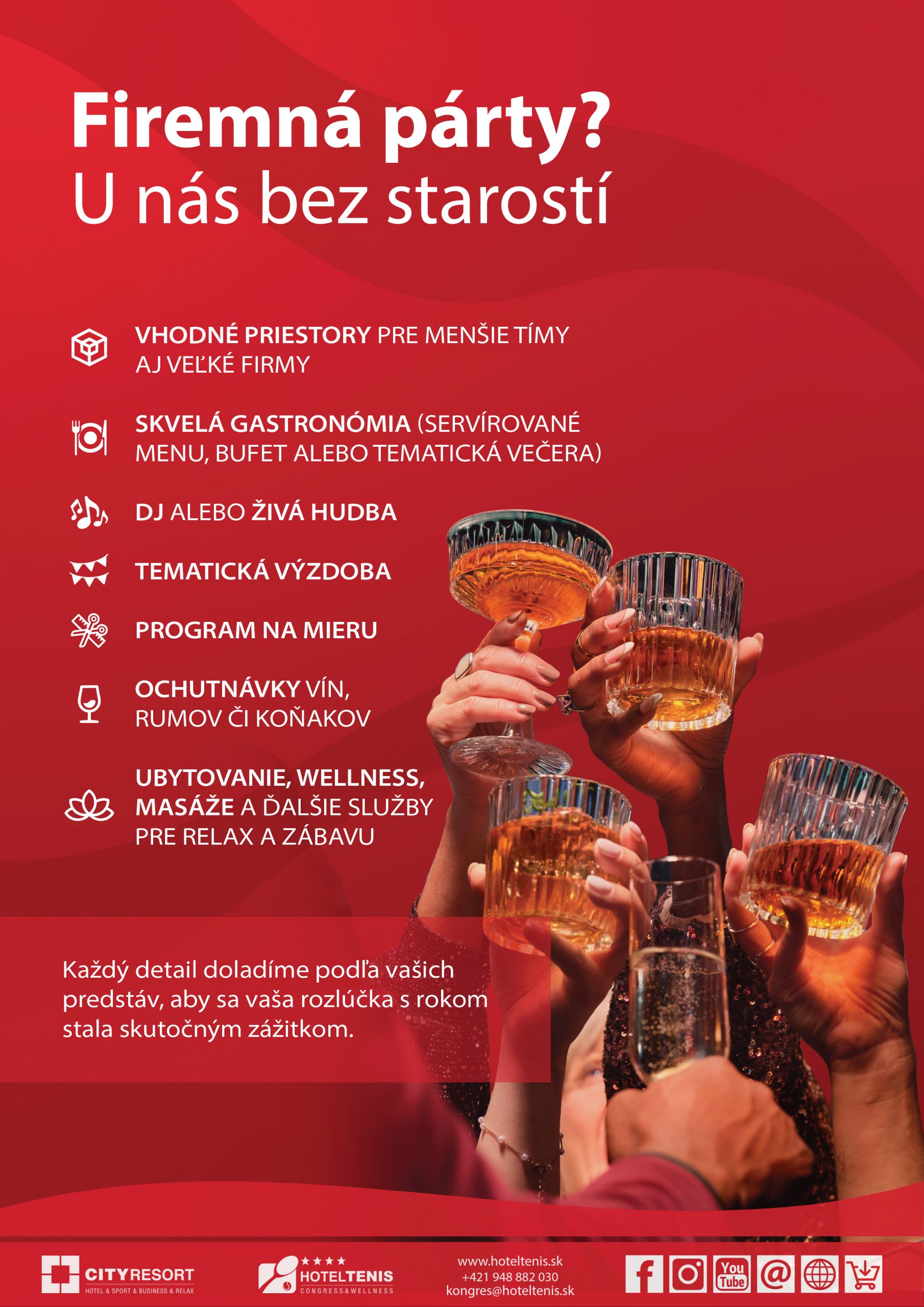 Koncoročný firemný večierok je ideálna príležitosť poďakovať sa kolegom, posilniť tímového ducha a spoločne osláviť úspechy roka. Postaráme sa o skvelú atmosféru, chutné jedlo, hudbu a zábavu, aby ste si večer užili bez starostí.